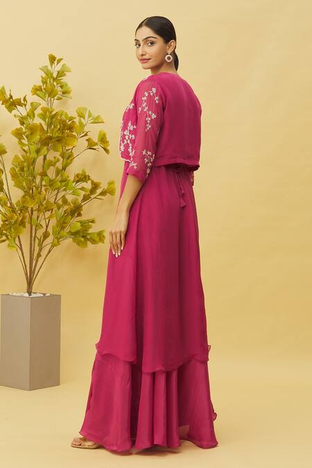 Magenta jacket featuring embroidered floral belt pattern with cutdana and sequin work. Paired with a matching long kurta and skirt, complemented by a belt.