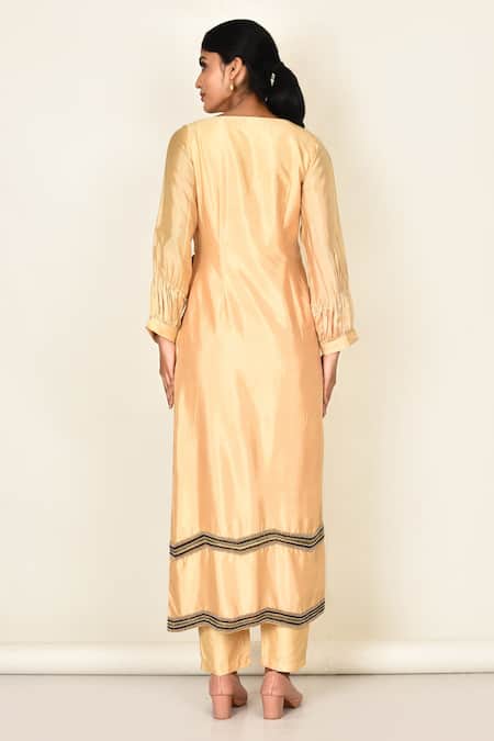 Yellow kurta featuring scallop neckline and pleated sleeves with floral embroidered motifs. Paired with matching pant featuring embroidered hem.