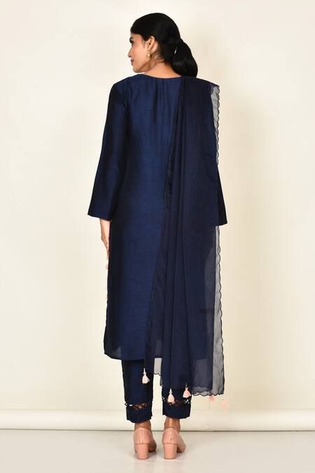 Navy blue straight kurta featuring floral embroidered motifs and a loop neckline. Paired with matching pant and sheer dupatta with scallop and tassel borders.