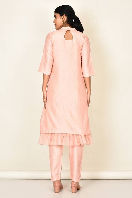 Peach kurta featuring floral embroidered motifs and a front cut-out neckline. Paired with matching pants, this set is made from silk and organza fabrics.