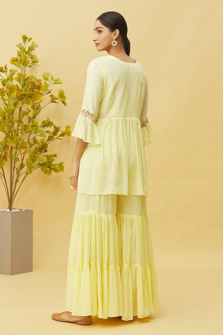 Yellow floral peplum top featuring crystal embellished floral patterns. Paired with a tiered sharara and dupatta.