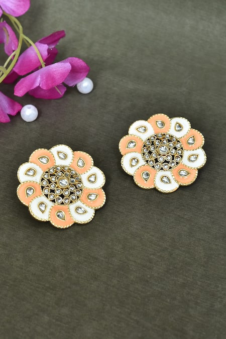 Gold tone stud earrings featuring white and peach enamelling with intricate kundan embellishments
