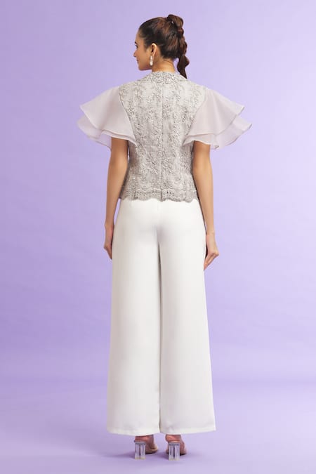 Grey Organza, Lace Embroidery Round Neck Floral Pattern Top