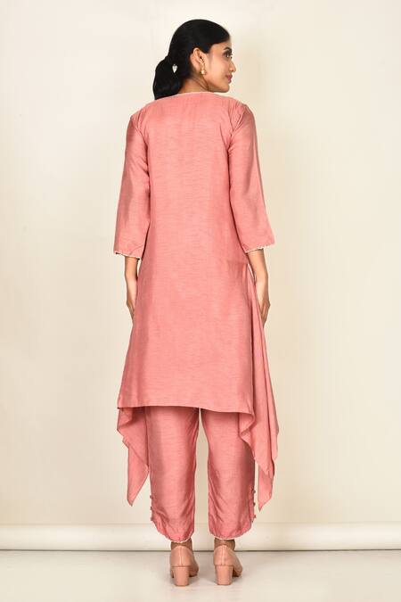 Blush pink kurta featuring floral embroidered motifs on the yoke and front button detailing. Paired with matching pants with lace hem and relaxed fit.