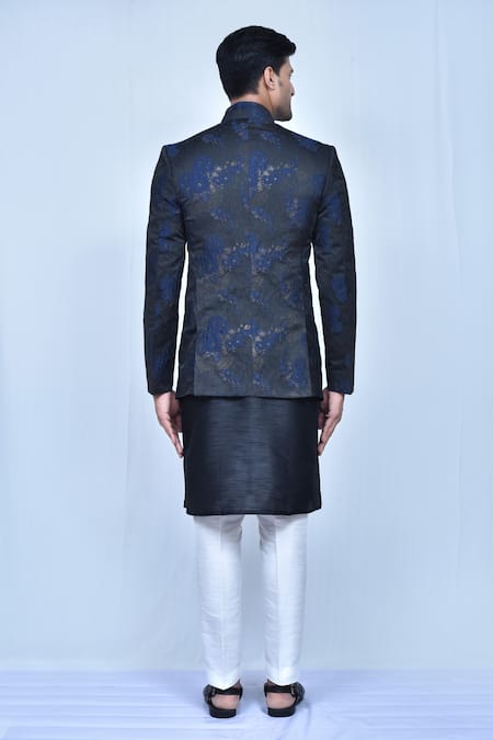 Black prince coat featuring floral jacquard print, paired with a black kurta and white straight pant. The kurta has a mandarin collar and full sleeves with a side slit.