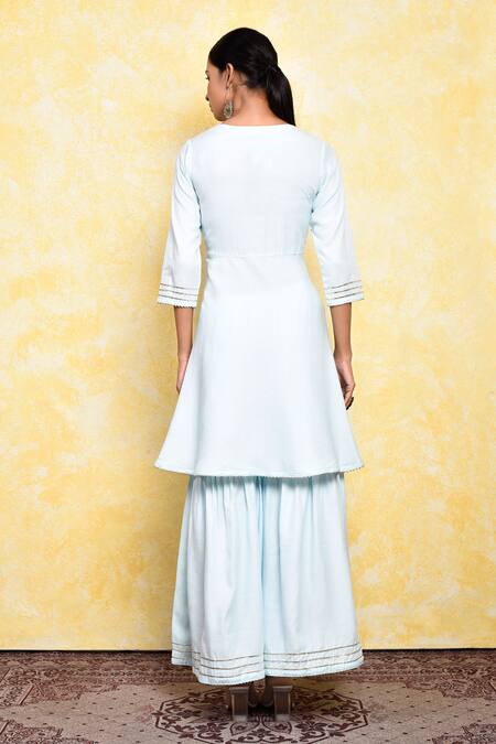 Ice blue cotton kurta with floral printed yoke. Comes with sharara.