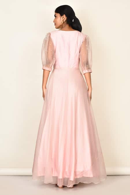 Baby pink layered anarkali featuring floral embroidered motifs and pleated detailing