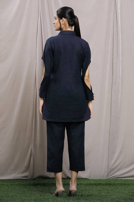 Buy_Samyukta Singhania_Blue Cotton Collared Patchwork Placement Shirt Tunic With Pant_at_Aza_Fashions