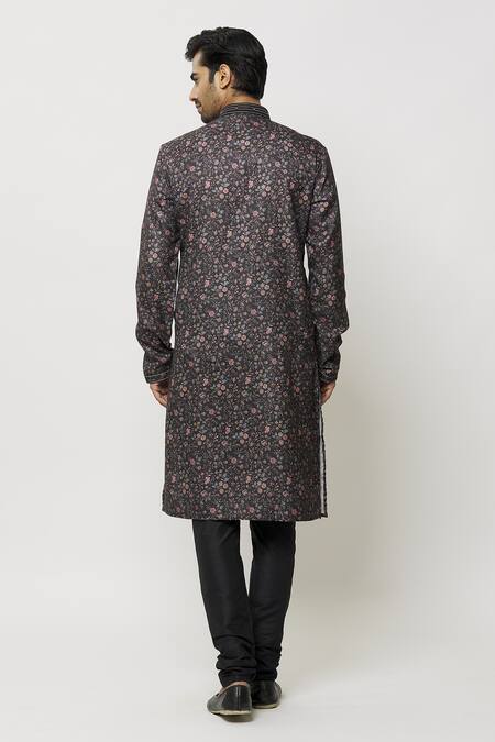 Black kurta featuring full sleeves and a mandarin collar in dupion art silk with an all-over plumeria garden print. Paired with a matching churidar for a complete look.