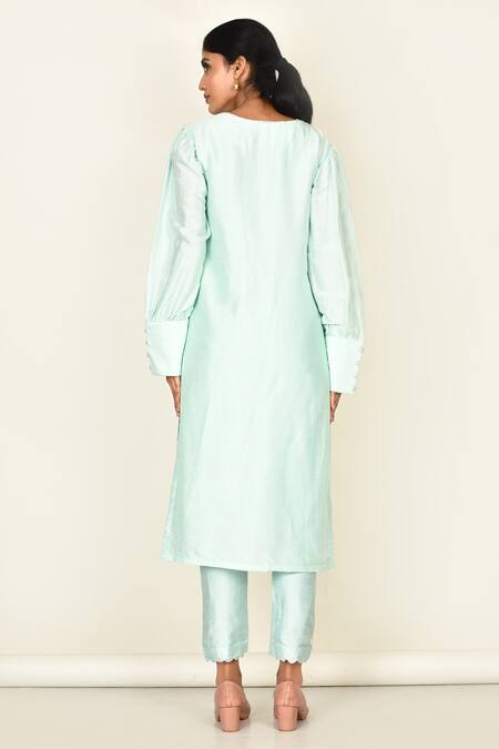 Blue kurta featuring puffed sleeves, scallop hem, and button detailing on cuffs. Paired with matching pants in a similar fabric.