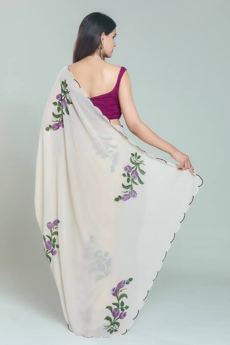 Beige georgette saree featuring tulip hand-painted illustrations and scallop borders
