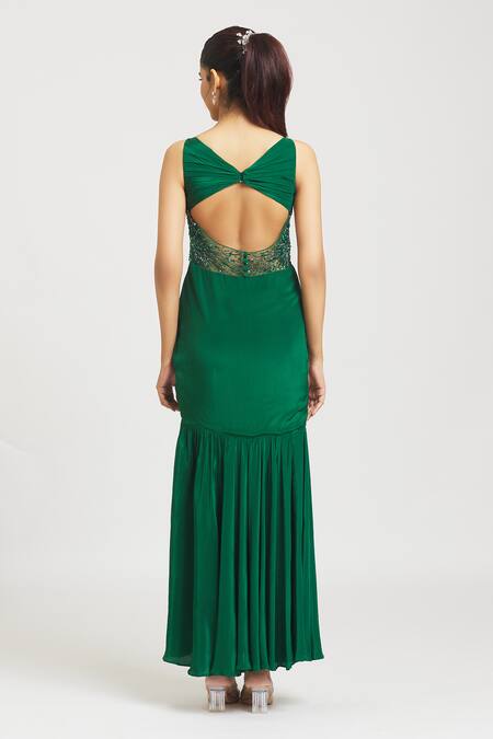 Emerald Green Net, Crepe Cutdana, Bead Leaf Waistband Embroidered Mermaid Gown