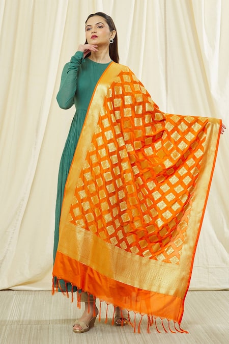 An orange Banarasi Art Silk dupatta featuring a woven floral geometric pattern with fringe hem details.