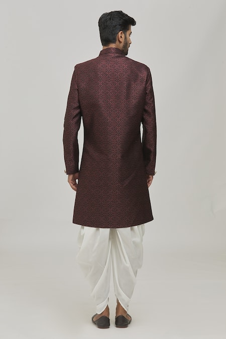 Wine Jacquard, Silk, Cotton Embroidery Woven Floral Pattern Sherwani Set