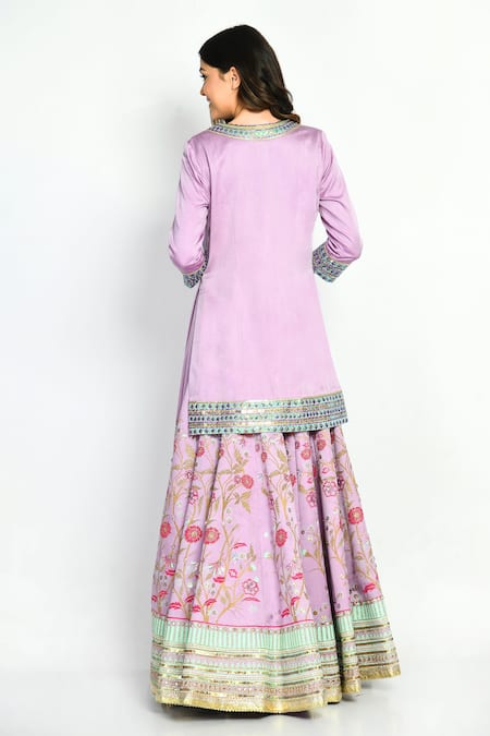 Lavender kurta with attached cancan & geometric embroidered bodice. Paired with floral print sharara & dupatta.