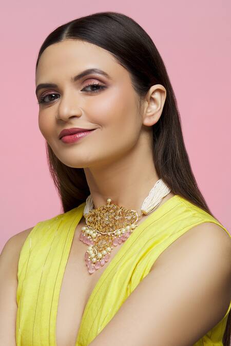 22kt gold plated choker featuring pink semi-precious kundan stones, pearl drops, and geometric motifs