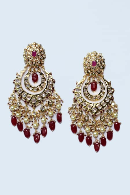 Buy_Kiara_Red Beads, Diamonds, Stones Half Crescent Shaped Chandbalis_Online_at_Aza_Fashions