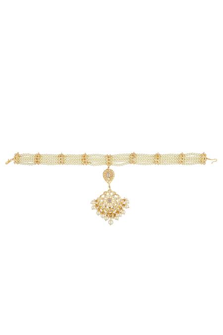 22kt gold plated mathapatti featuring off-white semi-precious kundan stones, pearls, and rock crystals