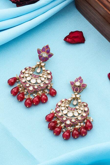 Gold toned chandbalis featuring kundan, pearl, red toned beads, and pink stone embellishments. Dimensions are 8.5 cm in length and 3.5 cm in width with a push lock closure.