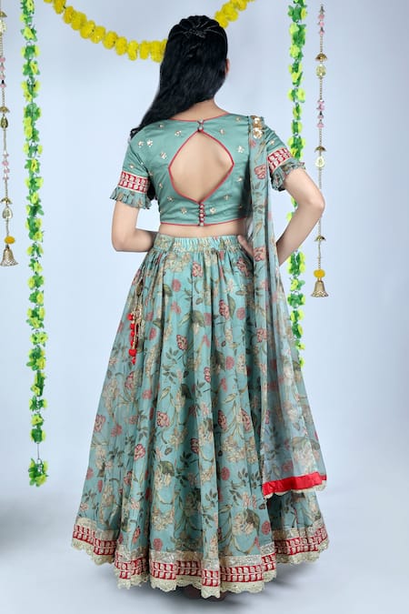 Green Silk, Cotton, Chanderi, Chiffon Tassels, Beads Floral Print Lehenga Set