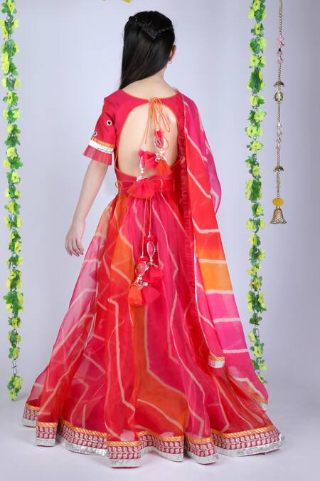 Red Silk, Cotton, Organza Mirrors Lehriya Print Lehenga Set
