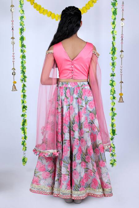 Buy_Kids Lane_Pink Silk, Cotton, Chanderi, Chiffon Tassels Tulip Print Lehenga Set_at_Aza_Fashions