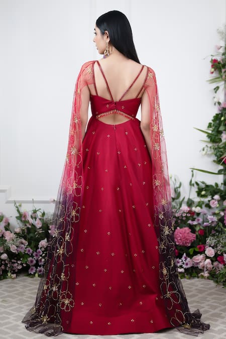 Red Chanderi Anarkali featuring a criss cross neckline and padded bodice