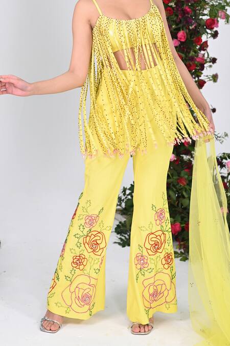 Yellow sleeveless top featuring crystal fringe embellishments and padding. Paired with a cancan sharara adorned with rose bloom crystal embroidery and a net dupatta.