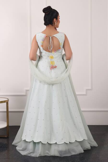 Mint green anarkali featuring a padded bodice with floral embroidery and sequins. Accompanied by a net dupatta embellished with floral sequins.
