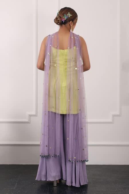 Lime green kurta featuring floral hand embroidery and a side slit. Paired with a lilac sharara and a choker dupatta made of net with sequin tikki and floral work.