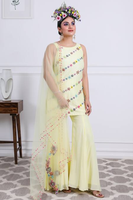 Yellow kurta featuring a round neckline and sleeveless design with floral embroidery. Paired with a sharara and a dupatta, both adorned with placement floral embroidery.