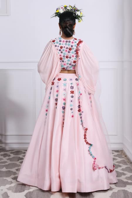 Pink lehenga featuring floral hand embroidery with attached cancan. Paired with a deep V neck padded blouse and a dupatta with embroidered border.