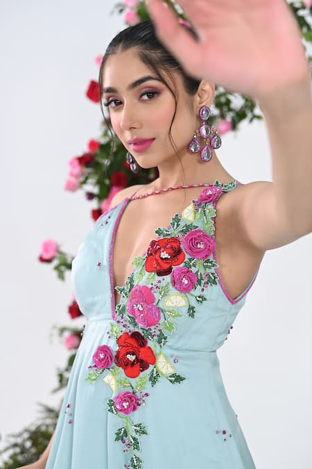 Blue Satin, Organza Sequins, Beads Plunge Neck Rose Bloom V Gown