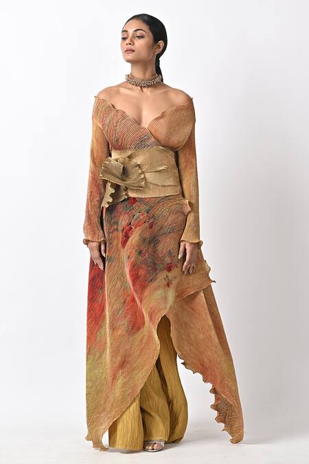 Buy_Kiran Uttam Ghosh_Yellow Polyester One Shoulder Abstract Print Wrap Dress_Online_at_Aza_Fashions