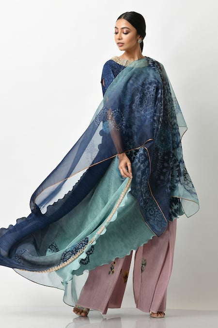 Aqua to navy blue draped dress in pleated base with batik motif prints & hand embroidered neckline.