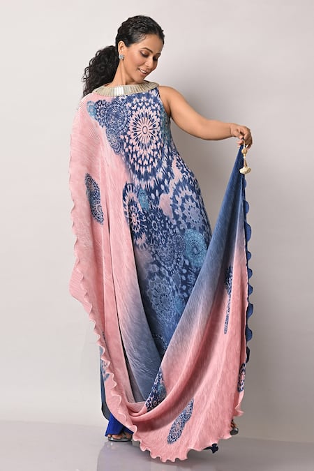 Pink & blue ombre pleated gown with batik circle prints, attached drape with embroidered neckline & tassel detail