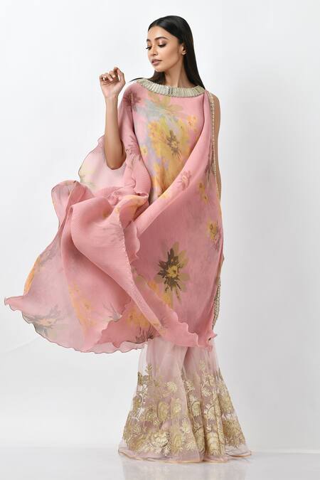 Peach draped dress in pleated base with flora motif prints & hand embroidered neckline & pleated details. Comes with an inner.