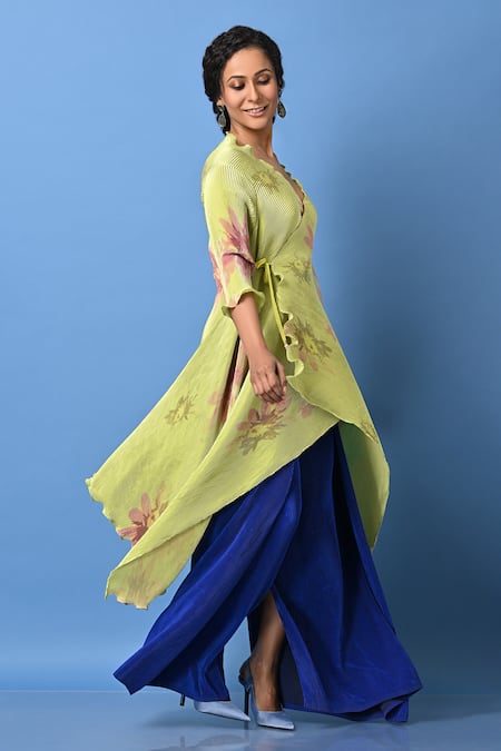 Buy_Kiran Uttam Ghosh_Green Pleated Polyester Mix Floral Motifs V Neck Print Wrap Dress _at_Aza_Fashions