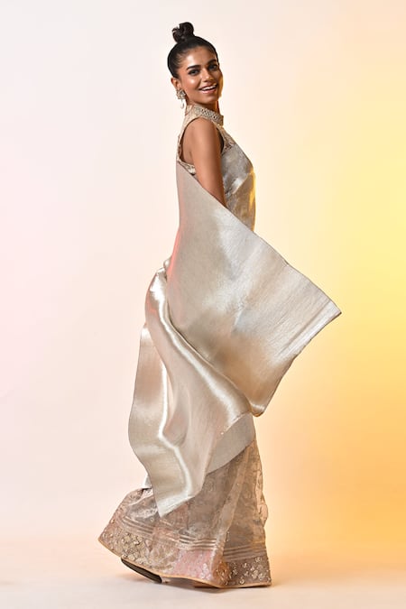 Liquid silver pleated saree featuring hand embroidery. Comes with an unstitched blouse.
