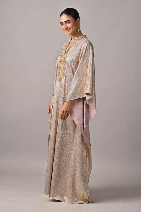 Ivory kaftan dress featuring hand embroidery and a flowing silhouette.