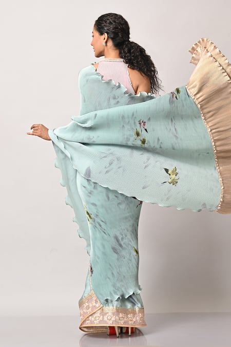 Mint saree with lilies flower printed motifs & embroidered hem detail. Comes with an unstitched blouse piece.