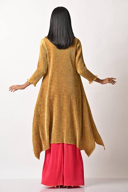 Buy_Kiran Uttam Ghosh_Gold Pleated Polyester Mix Geometric Round Kaftan _Online_at_Aza_Fashions