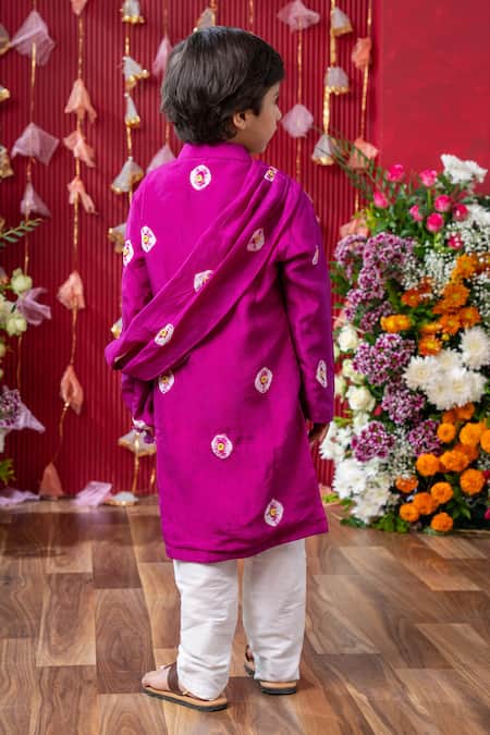 Magenta Cotton, Silk Fabric Flowers, Embroidery Bandhini Tie-dye Kurta Set