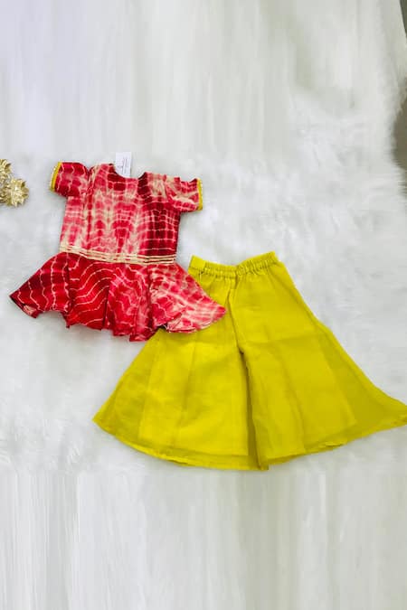 Red tie & dye top featuring a V neck and front buttons. Paired with a yellow palazzo made from cotton sparkle fabric.