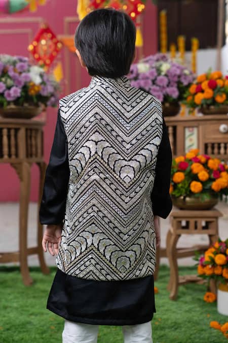 Black kurta set featuring a bundi with thread embroidered chevron patterns and sequin work. Paired with an inner kurta and straight pant.