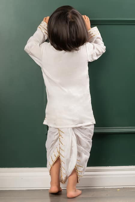 Off-white kurta featuring beaded embroidery and gota lace detailing. Paired with a matching dhoti pant with an elasticated waistband.