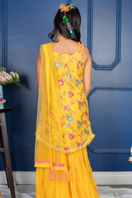 Yellow kurta in pure chanderi silk featuring all over flora embroidery and sequin highlights. Paired with a matching sharara and mirror embroidered border dupatta.