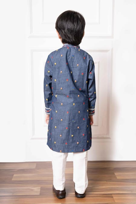 Blue kurta featuring multicolor thread embroidered floral blossom patterns and pockets. Paired with a straight pant for a complete look.