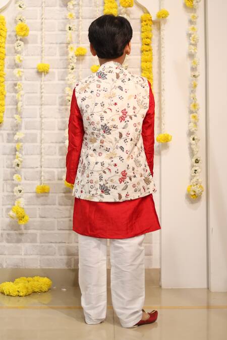 Red kurta featuring full sleeves paired with an off-white floral embroidered bundi. The set includes a matching pyjama for a complete look.