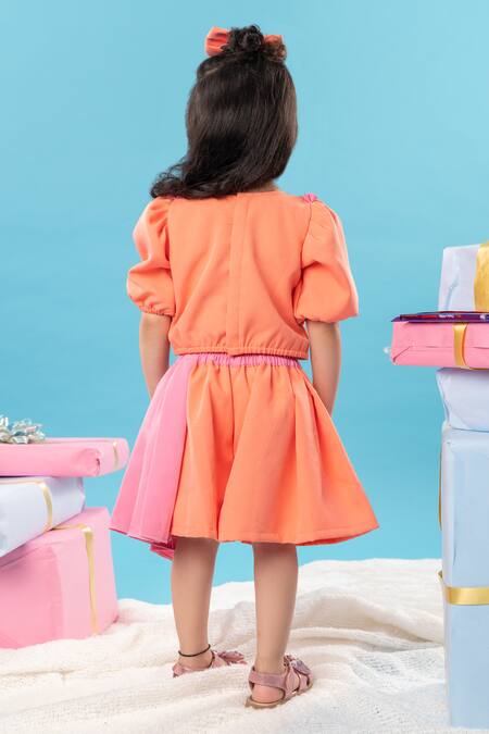 Pink crop top featuring puffed sleeves and round neckline with frilly lace detail. Paired with a color-blocked skirt adorned with a bow detail.
